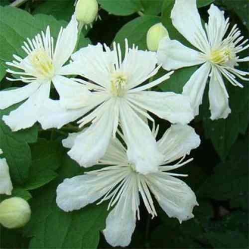 Околоцветник состоит из 4-8 чашелистиков. Цветы у данного вида белые, состоят из 3-7 лепестков. В период цветения на одном растении может образовываться до нескольких сотен красивых, белоснежных цветков. Плод клематиса Маньчжурского представляет собой многоорешек. Период цветения приходится на конец июня – начало июля.